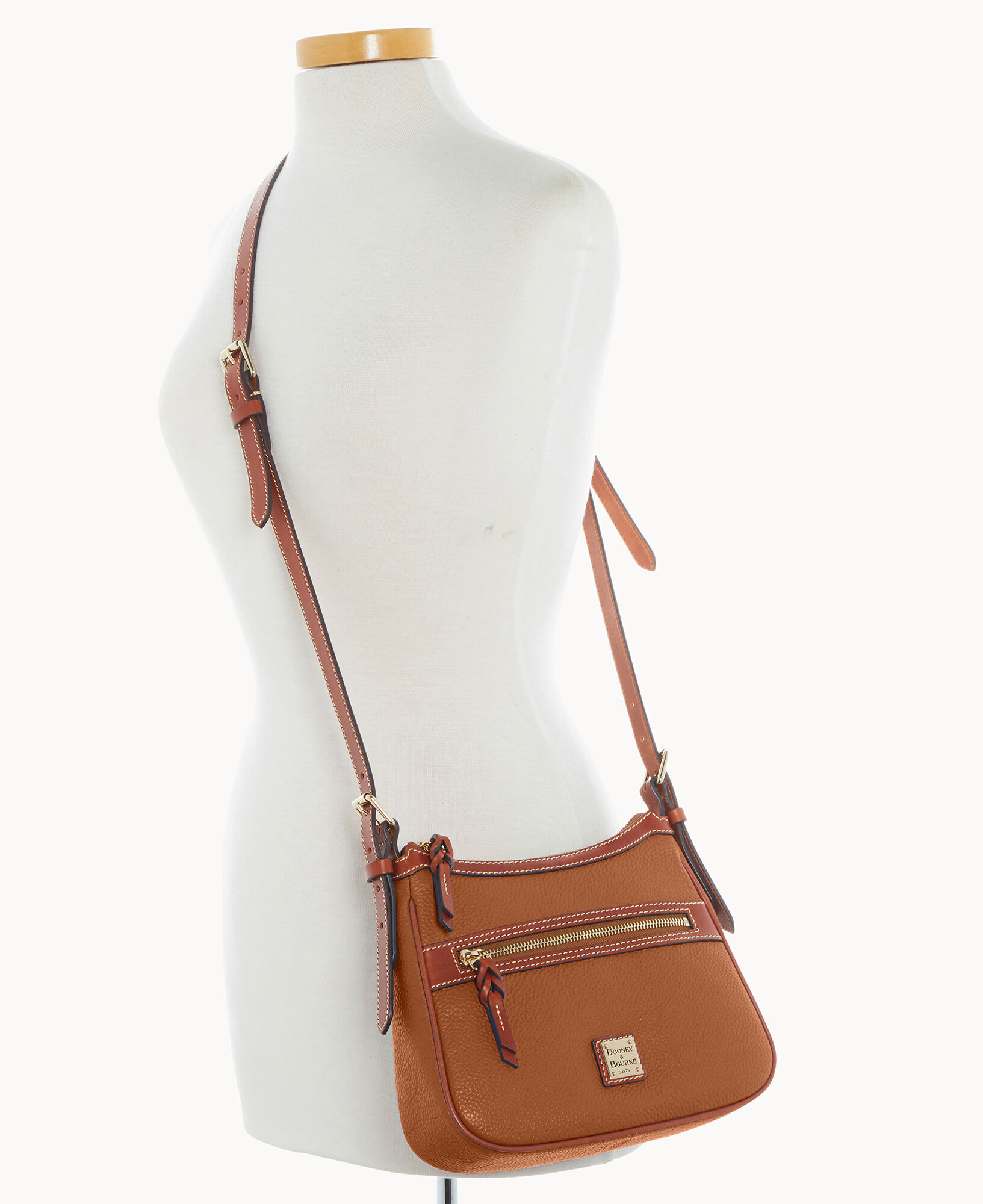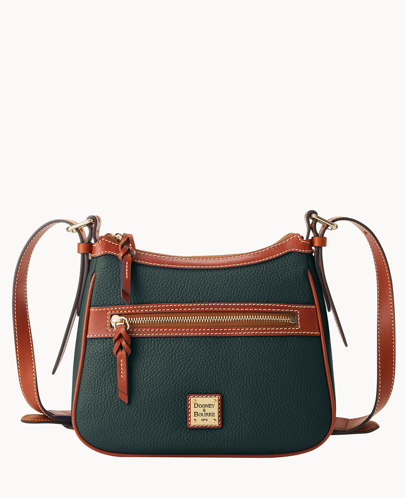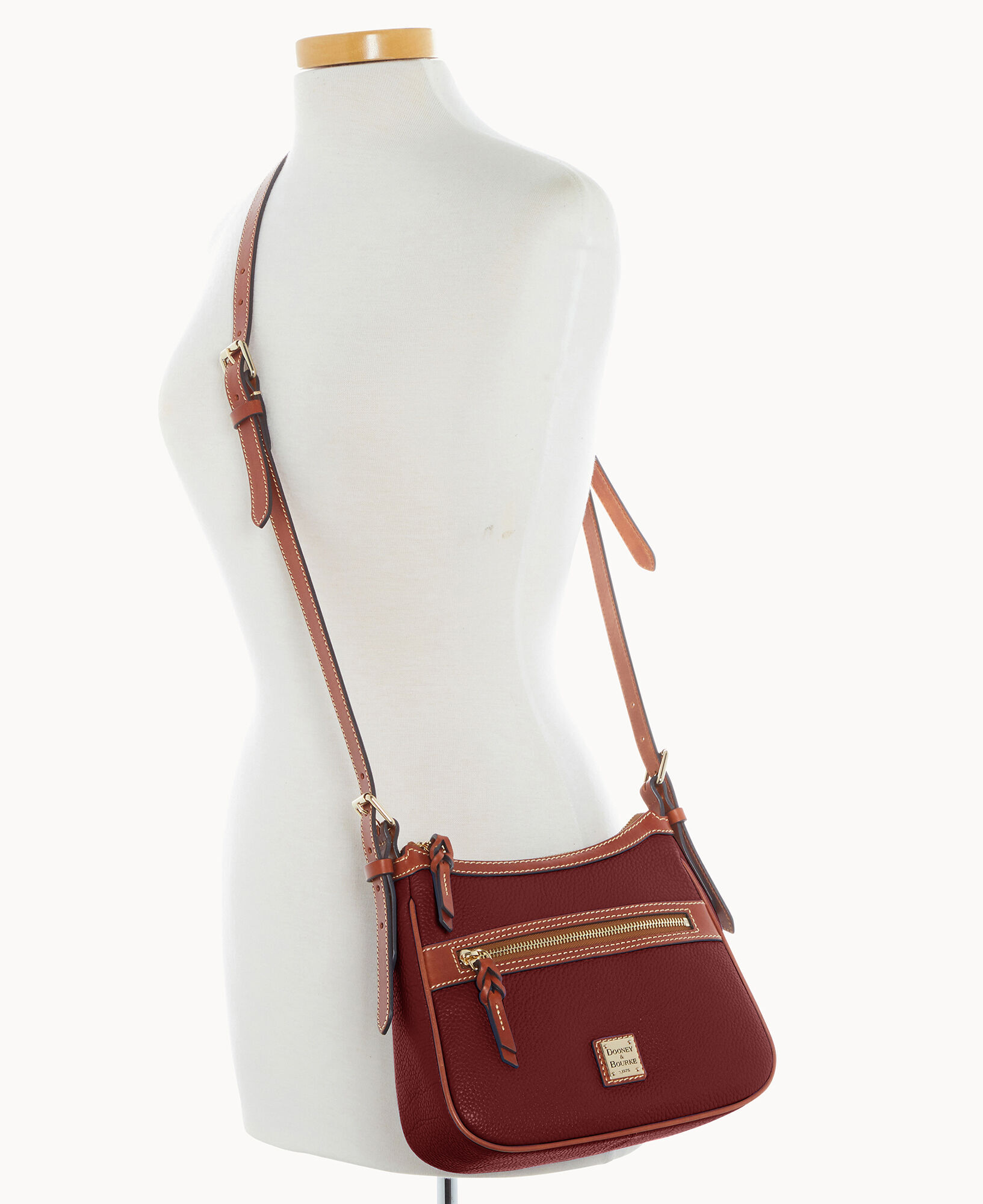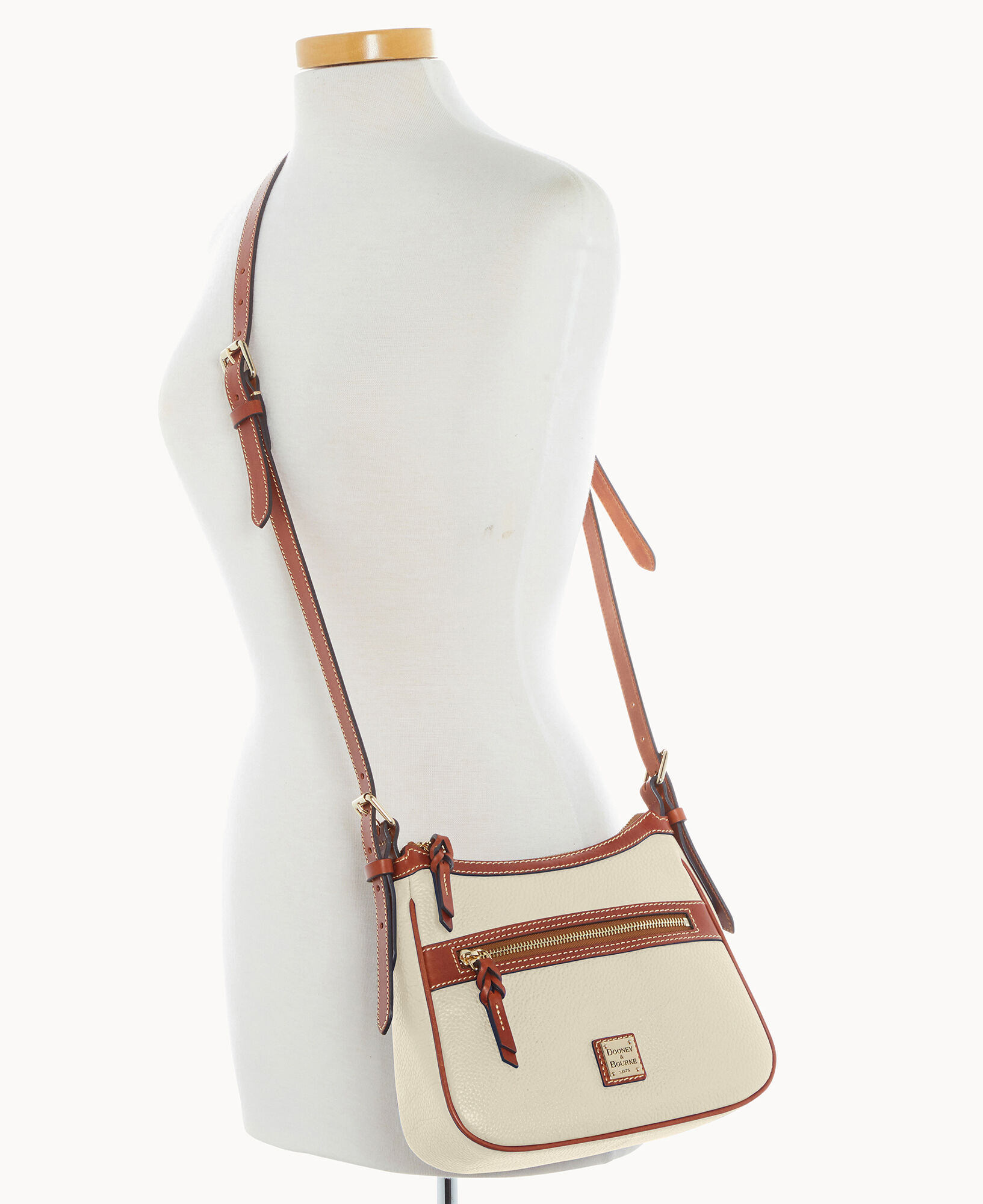 Outside zip pocket. Inside zip pocket. Two inside pockets. Inside key hook. Adjustable strap. Strap drop length 25″. Lined. Zipper closure.