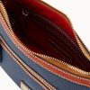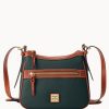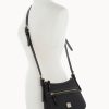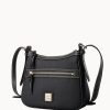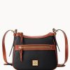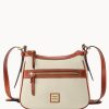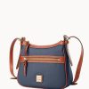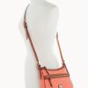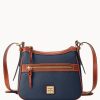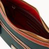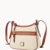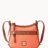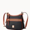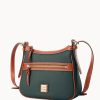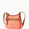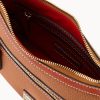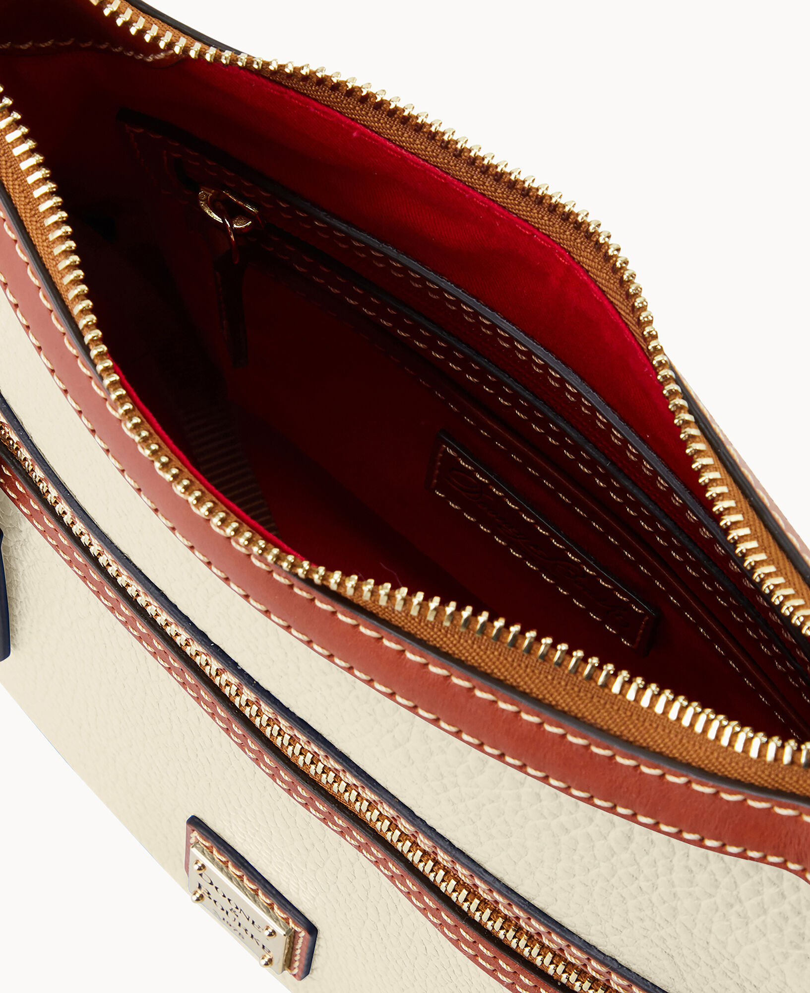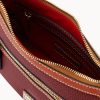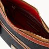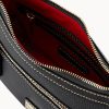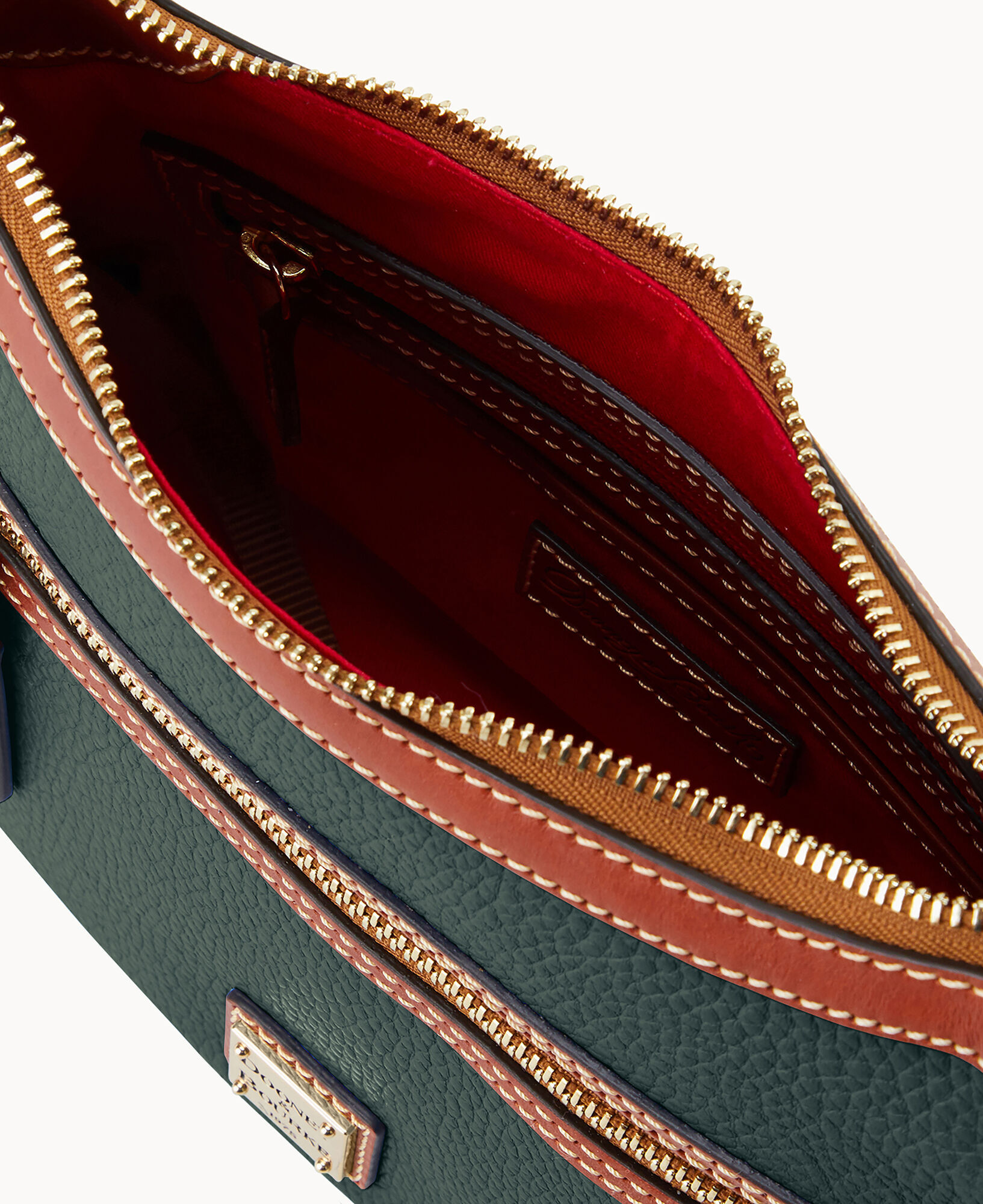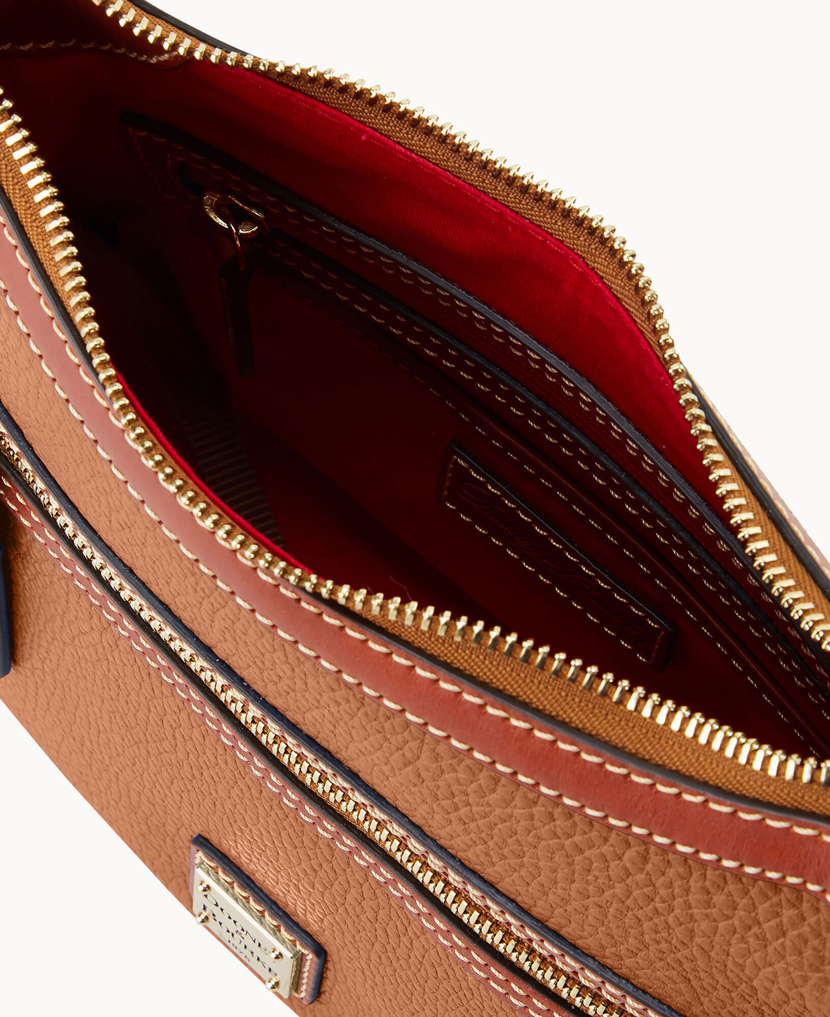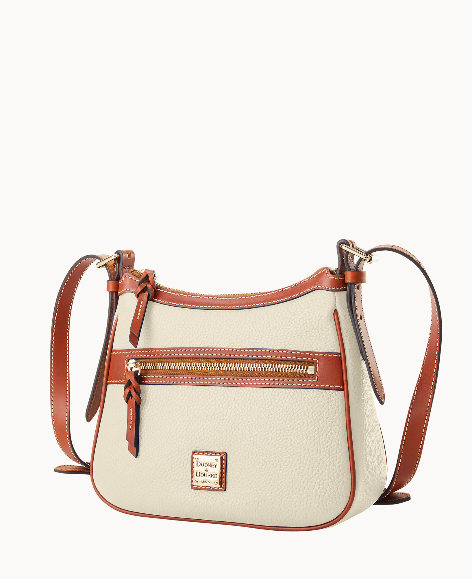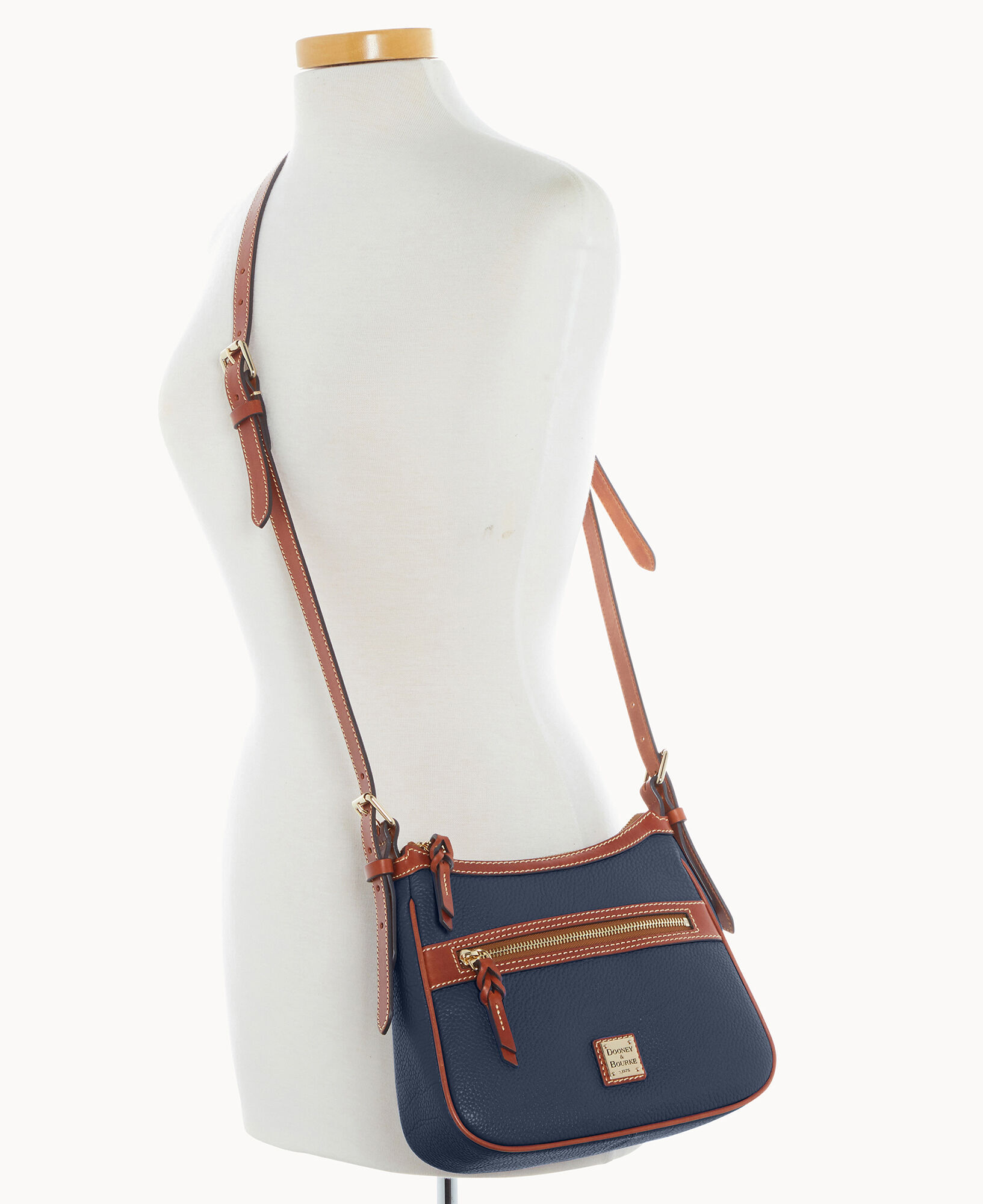 Outside zip pocket. Inside zip pocket. Two inside pockets. Inside key hook. Adjustable strap. Strap drop length 25″. Lined. Zipper closure.