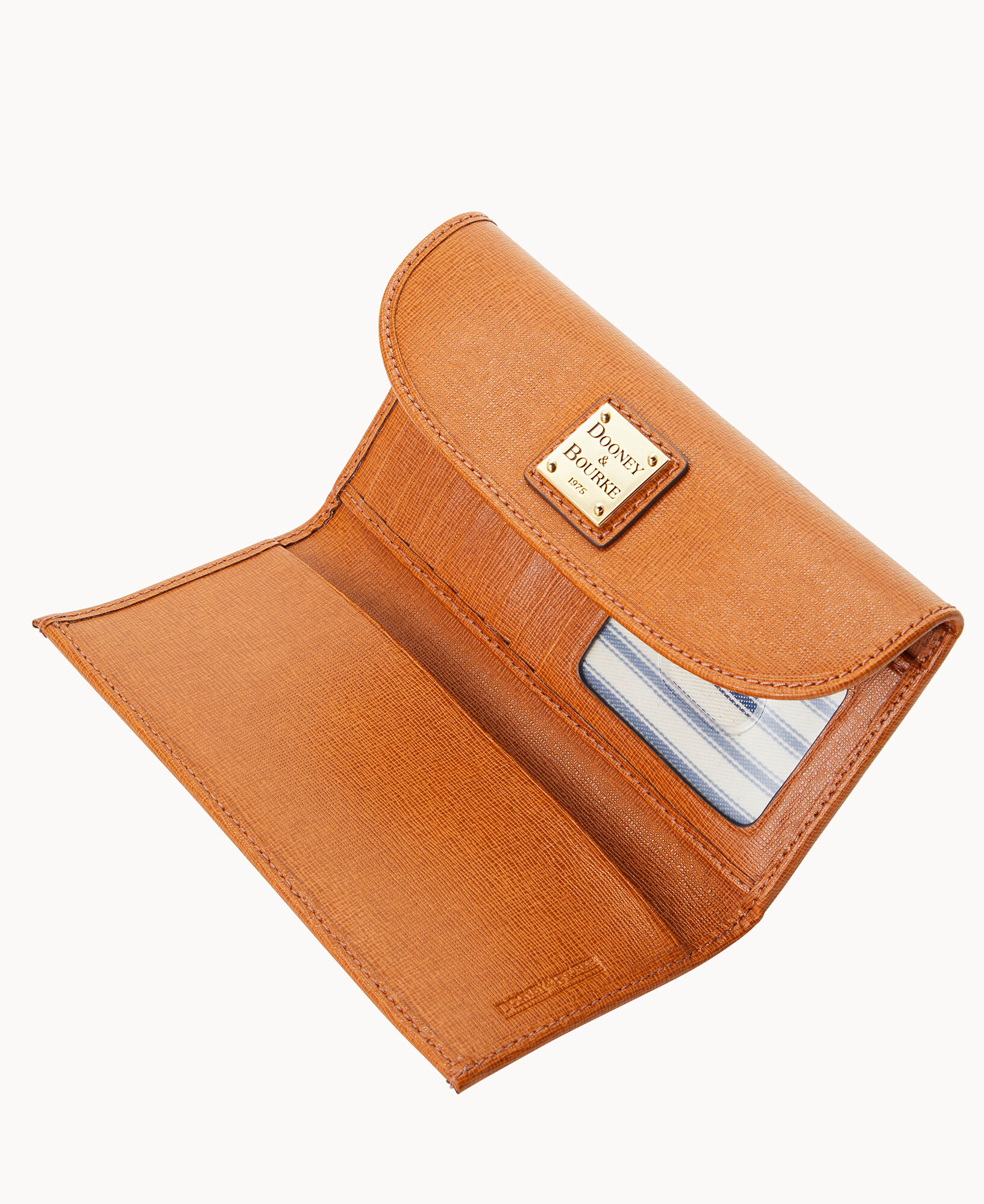 One outside zip pocket. One inside pocket. License pocket with window. Two bill compartments. Seven credit card slots. Lined. Feet. Snap closure.