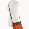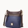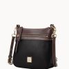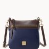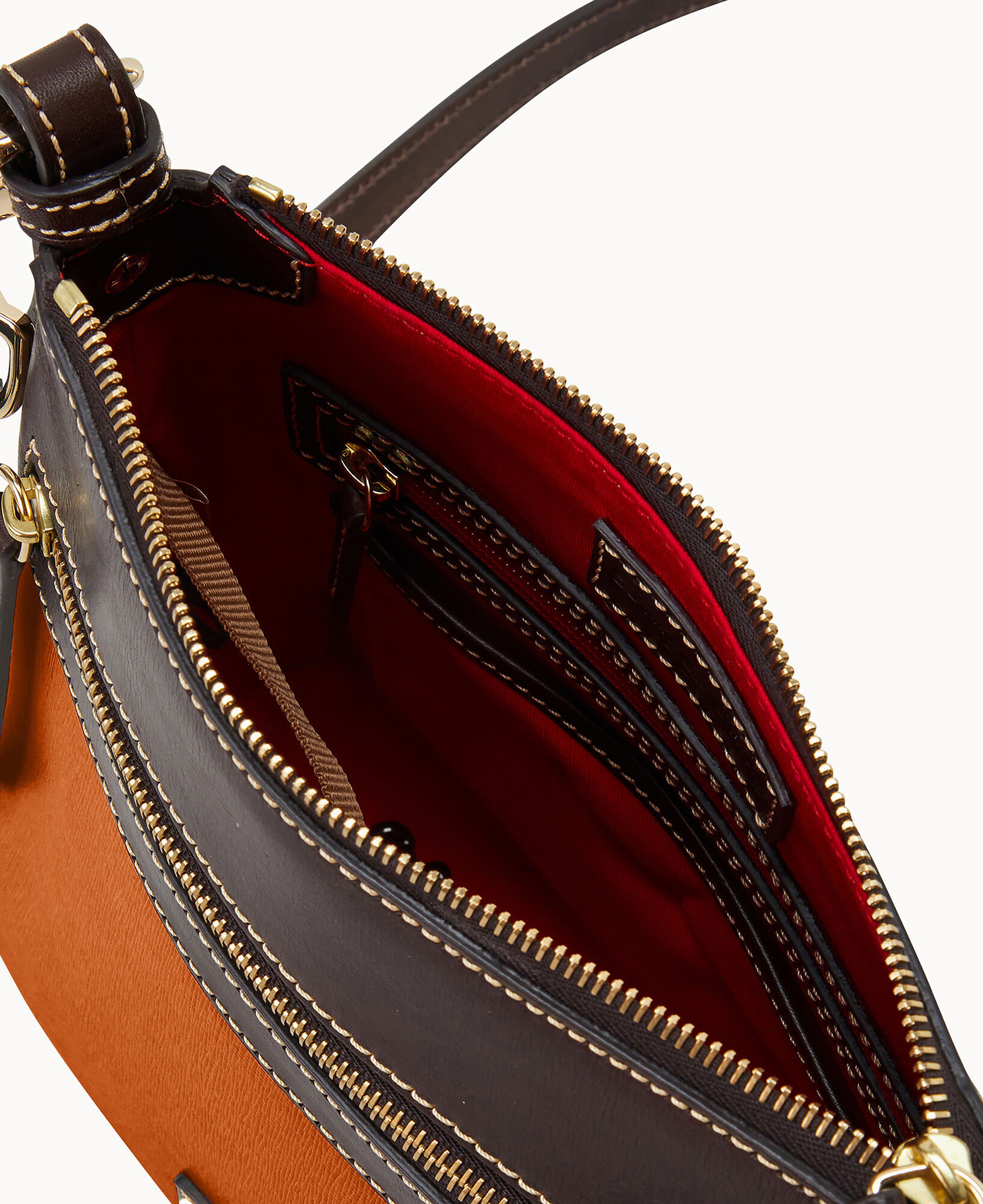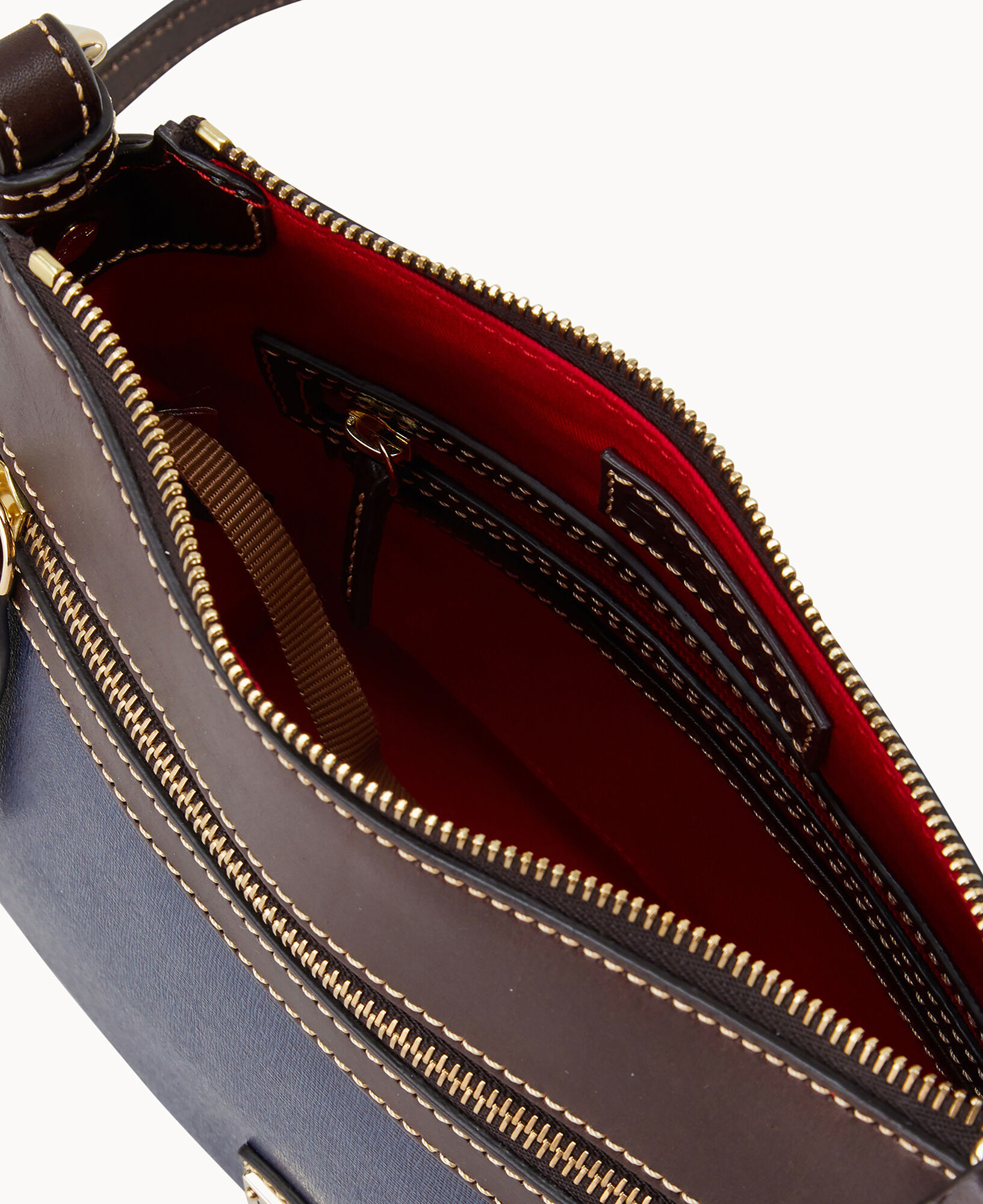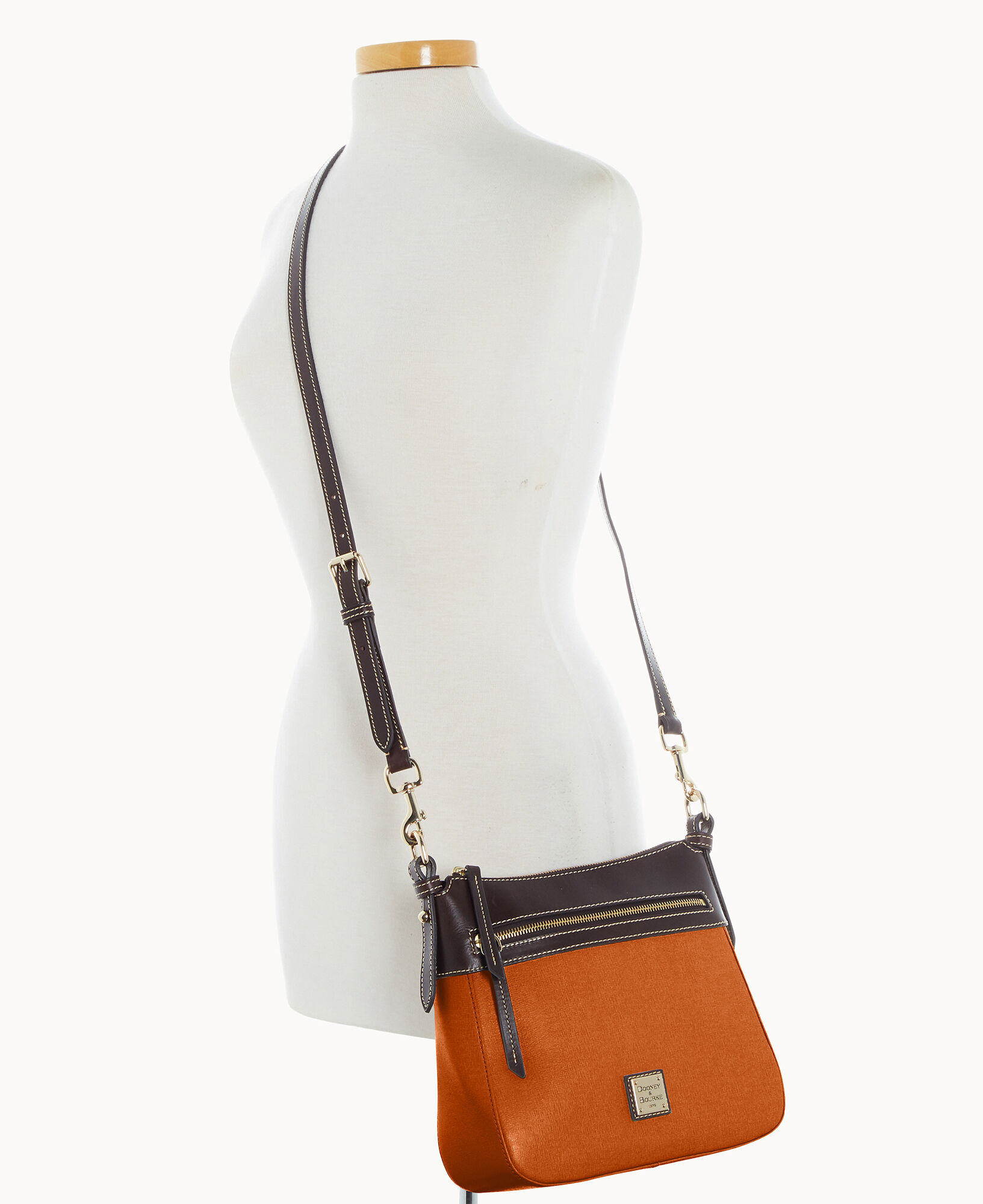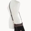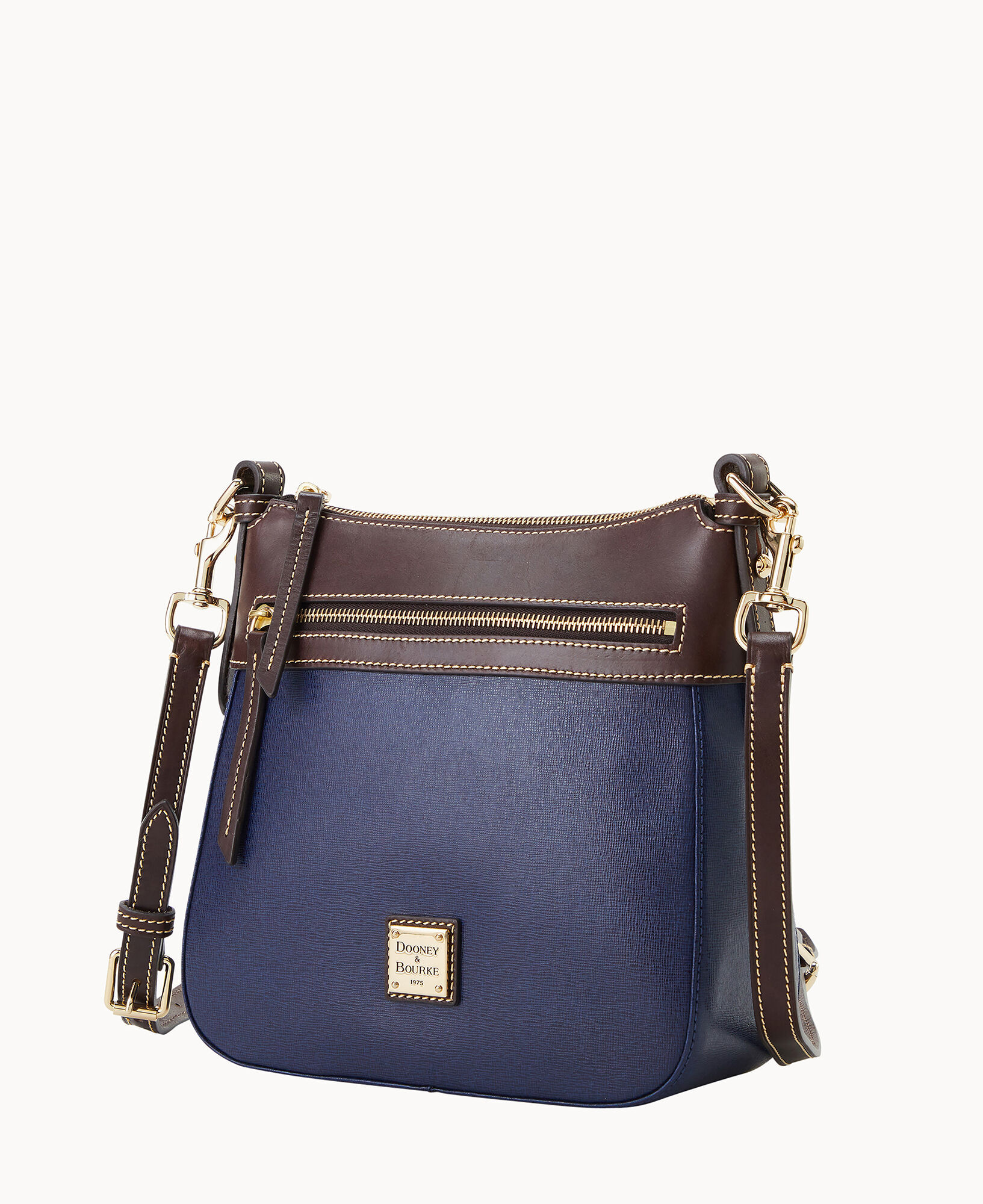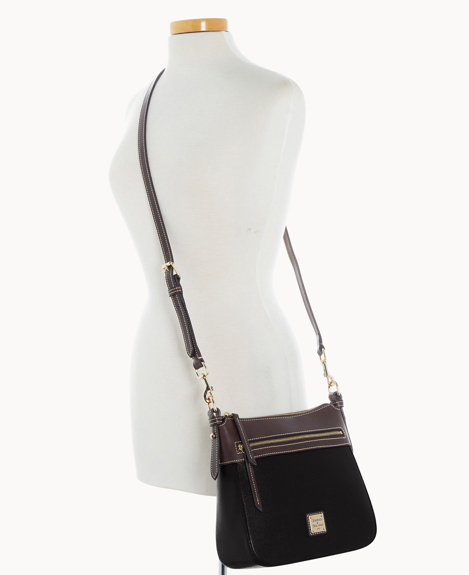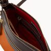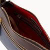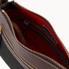 One outside zip pocket. One inside zip pocket. Two inside pockets. Adjustable, detachable shoulder strap. Strap drop length 27″. Inside key hook. Lined. Zipper closure.