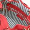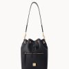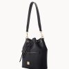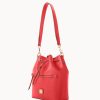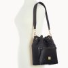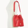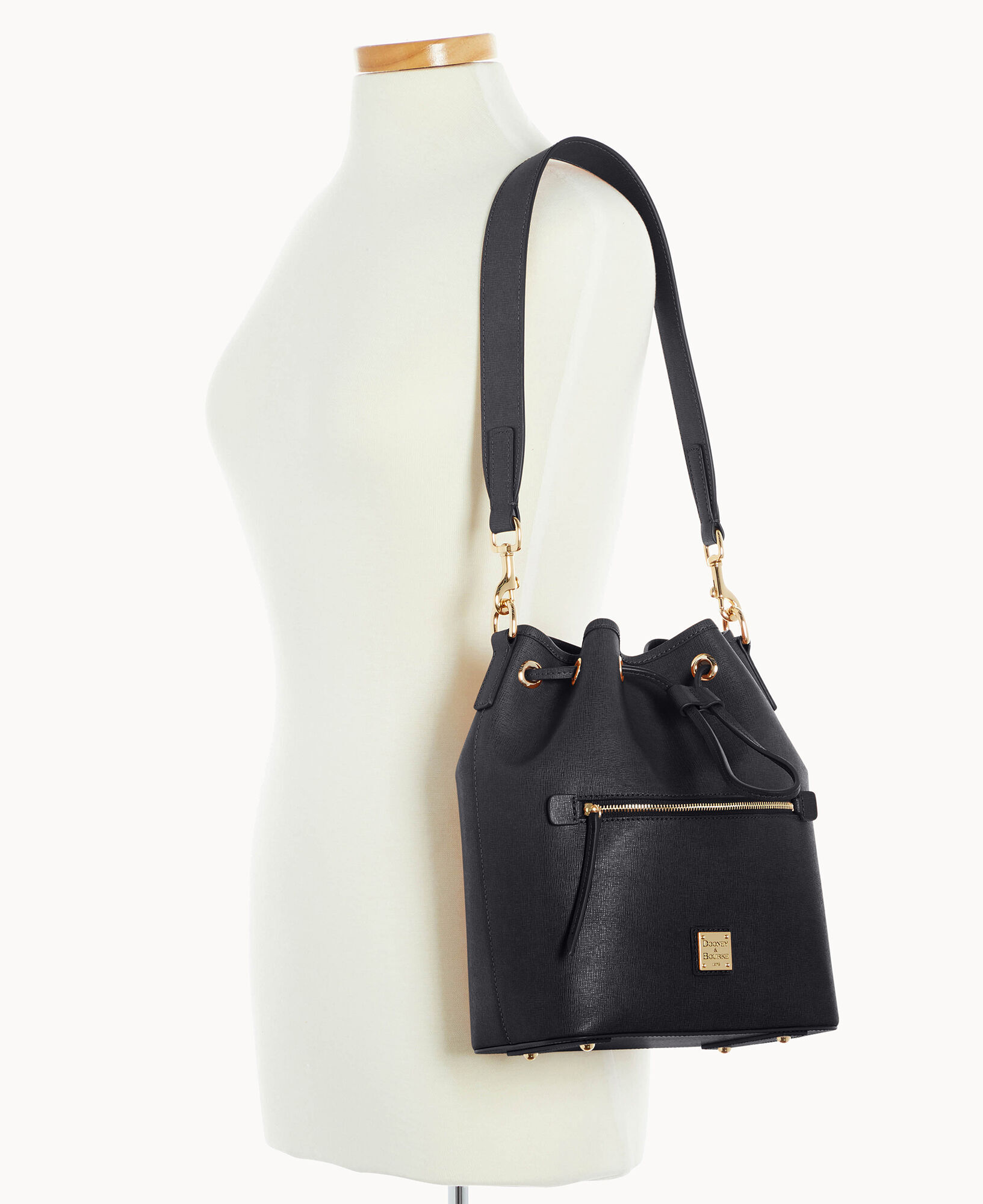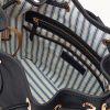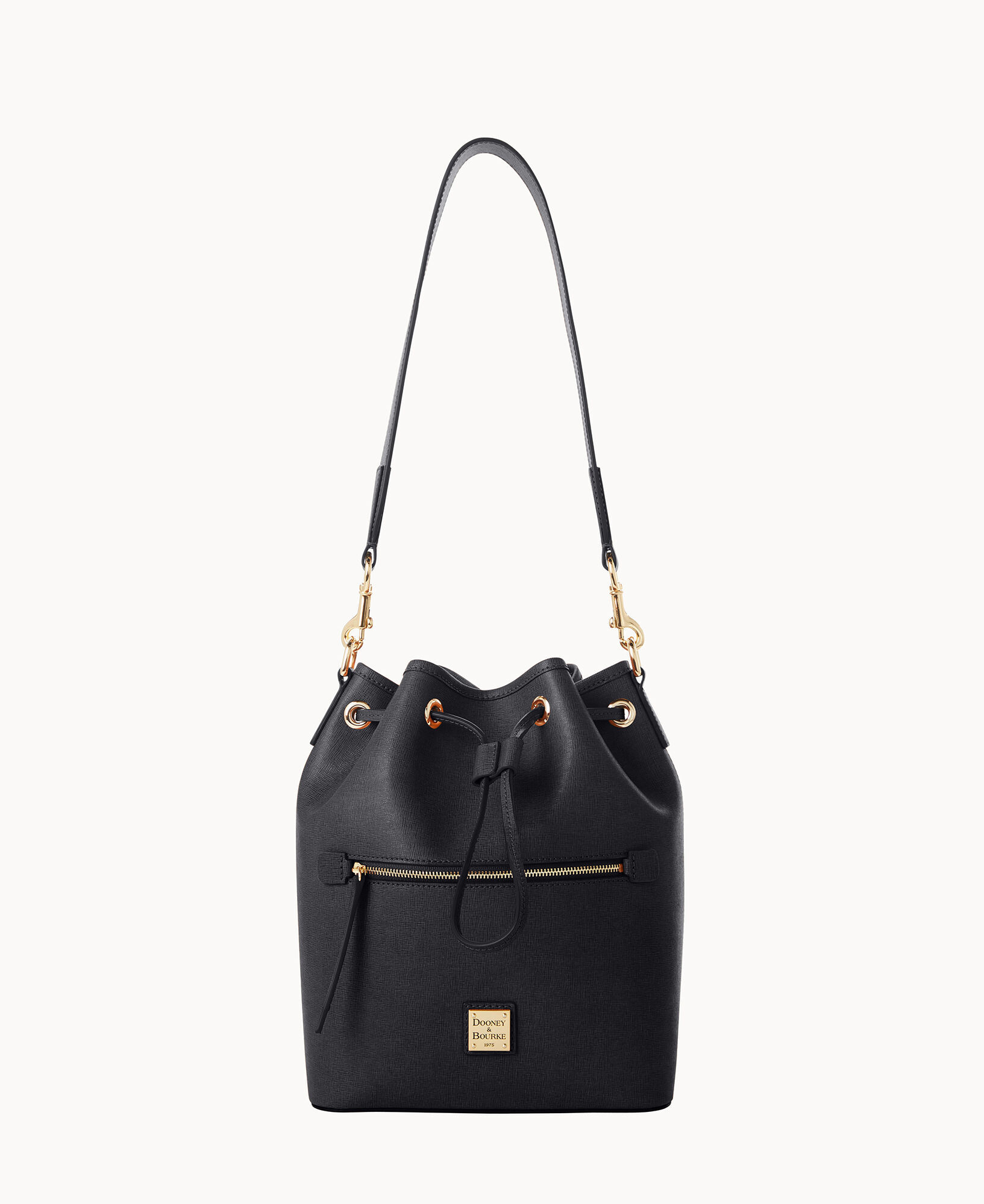 One outside zip pocket. One inside zip pocket. Two inside pockets. Cell phone pocket. Inside key hook. Detachable shoulder strap. Strap drop length 13″. Lined. Feet. Drawstring closure.