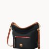 One outside zip pocket. One inside zip pocket. Two inside pockets. Cell phone pocket. Inside key hook. Adjustable, detachable shoulder strap. Feet. Zipper closure.
